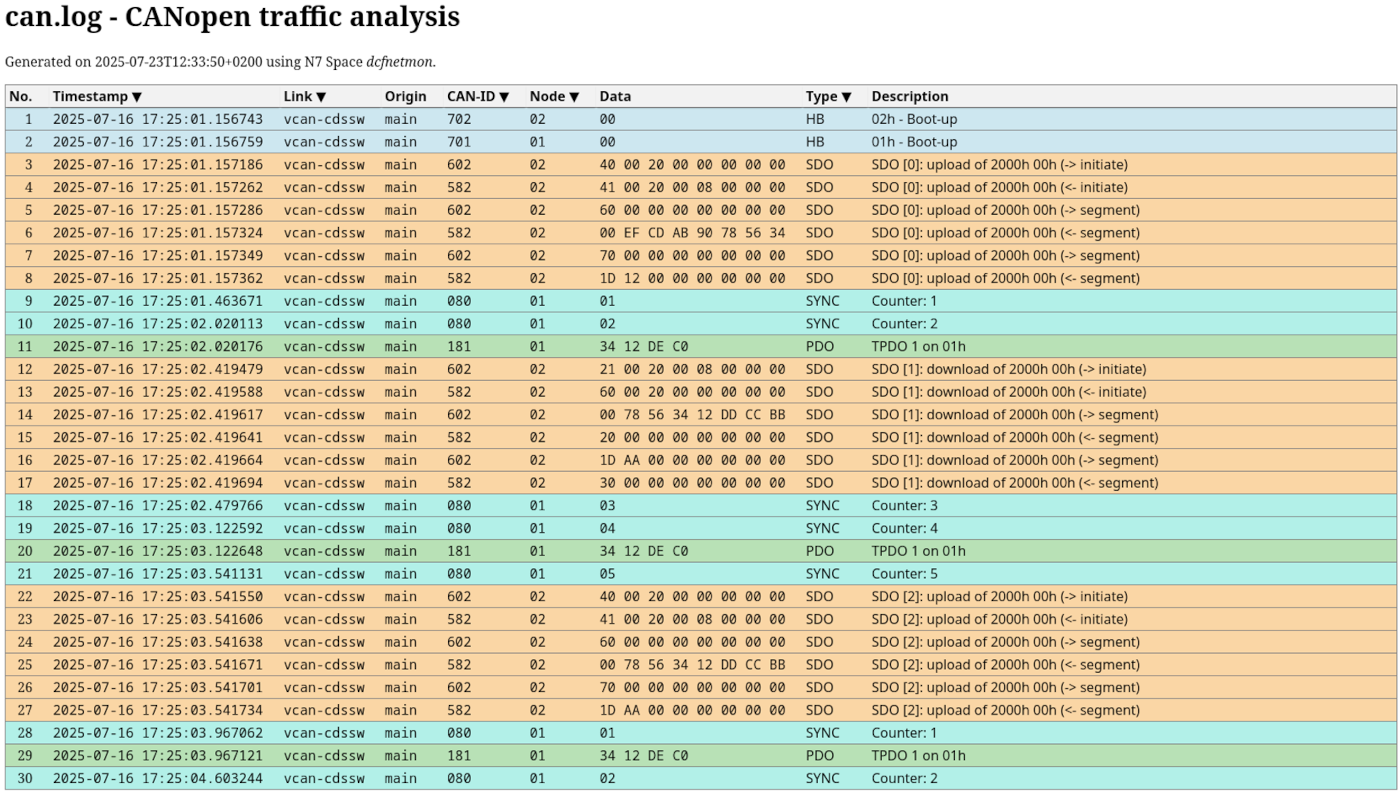Configuring a complete CANopen network with services across multiple nodes requires careful configuration of each node's Object Dictionary. Based on extensive experience, N7 Space provides a comprehensive set of tools for the CANopen network engineering process. The complexity of the Object Dictionary, especially in its "raw" version stored in standard DCF files, requires significant attention and manual verification by network engineers. The DCF file itself provides only key-value pairs; the interpretation of this data is defined in the CANopen standard CiA-306. N7 Space tools provide support on both levels – raw data stored in the Object Dictionary and its interpretation in the context of the whole network. They enable users to verify semantic correctness of multiple nodes building the CANopen network and offer comprehensive support for network editing. Our tools can also leverage network descriptions to support monitoring and instrumentation of live networks.